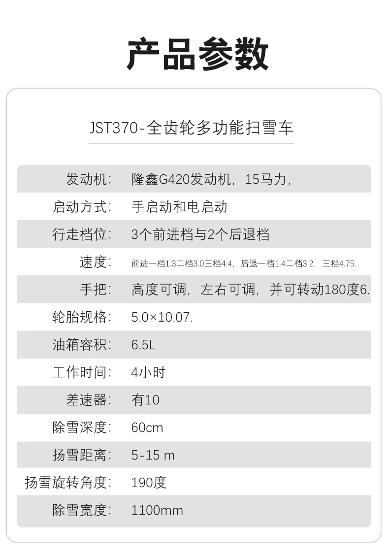 - 1. 发动机:隆鑫G420发动机,15马力,油箱容积6.5L 2. 启动方式:手启动和电启动 3. 行走档位:3个前进档与3个后退档 4. 速度(km/h):前进一档1.3二档3.0三档4.4, 后退一档1.4二档3.2,三档4.7 5. 手把:高度可调,左右可调,并可转动180度 6. 轮胎规格:5.0×10.0 7. 传动方式:全齿轮直接传动 8. 每箱油工作时间:约3小时 9. 差速器:有 10. 除雪宽度: 110cm 11. 除雪深度:60cm 12. 扬雪距离: 5-15 m 13. 扬雪旋转角度: 190度